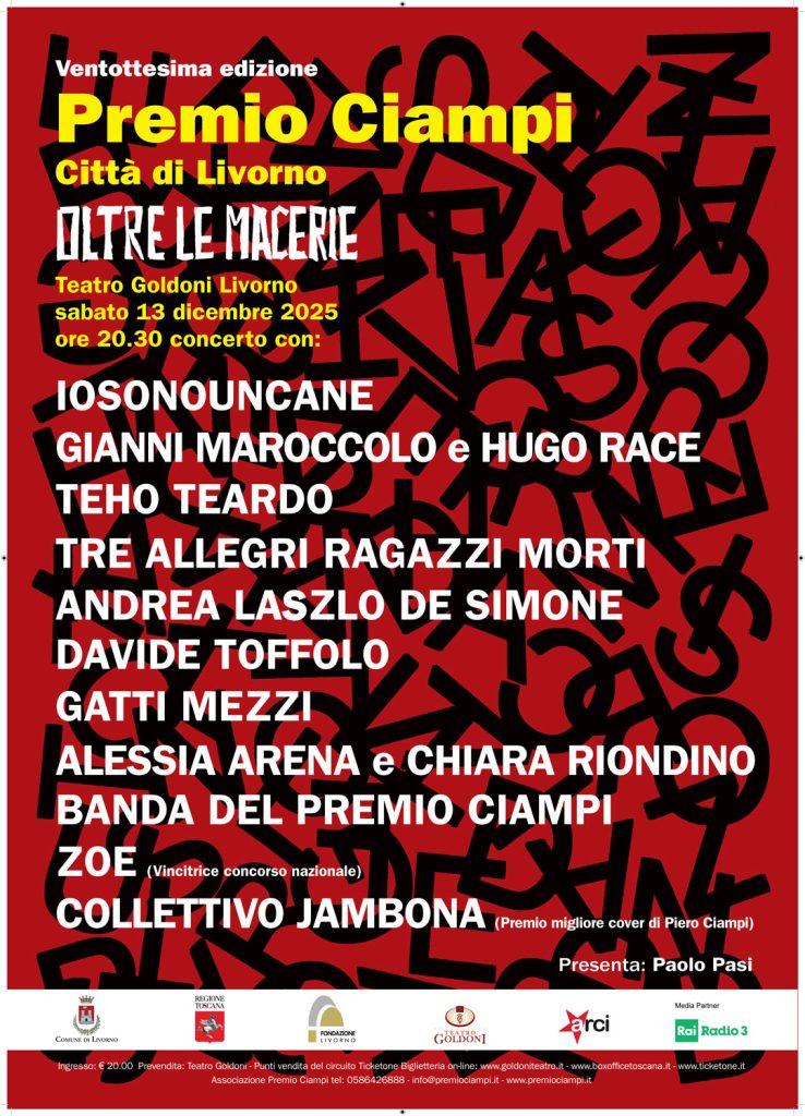 Torna il Premio Ciampi con una grande serata e tanti artisti che puntano sulla creatività, l’originalità e la passione contro ogni forma di omologazione culturale. Tra i protagonisti della serata Iosonouncane (“Premio speciale”), Gianni Maroccolo e Hugo Race (“Premio speciale”), Teho Teardo, , Tre Allegri Ragazzi Morti, (“Premio alla carriera”), Gatti Mezzi, Davide Toffolo (“Premio Ciampi a fumetti”), Alessia Arena e Chiara Riondino, La Banda del Premio Ciampi, Zoe (vincitrice del concorso nazionale) e Collettivo Jambona, vincitore miglior cover di Piero Ciampi. Ci sarà anche Laszlo De Simone che non si esibirà ma al quale verrà assegnato un premio speciale.